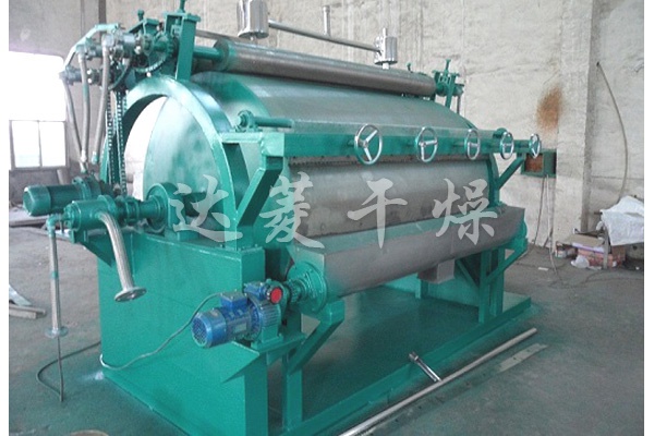 滾筒刮板干燥機(jī)是一種內(nèi)加熱傳導(dǎo)型轉(zhuǎn)動(dòng)連續(xù)干燥設(shè)備。旋轉(zhuǎn)的滾筒通過其下部料槽,粘附著一厚度的料膜,熱量通過管道輸送至滾筒內(nèi)壁,傳導(dǎo)到滾筒外壁,再傳導(dǎo)給料膜,使料膜中的濕度獲得蒸發(fā)、脫濕、使含濕分的物料獲得干燥。干燥好的物料被裝置在滾筒表面的刮刀鏟離滾筒,到置于刮刀下方的螺旋輸送器,通過螺旋輸送器將干物料集中、包裝。